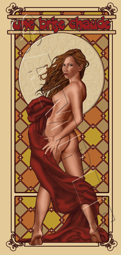 This print, “Une Bris Chaude” (A Warm Breeze), measures 17.5 X 8.” It is inspired by the art nouveau style of Alphonse Mucha. The art comes with a 2” mat, making it 21.5 X 12.” This print can also be flipped if you would like “bookend” style prints.